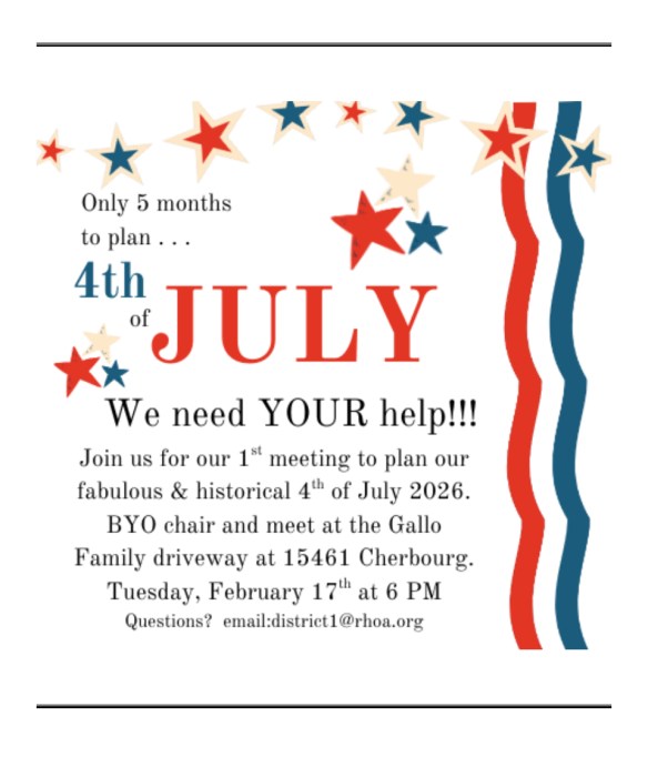 Join us this morning for the RHOA annual 4th of July parade (registration begins at 9:20am) and picnic! There will be tons of great raffle items, including a “Member Only Raffle”. We look forward to seeing you all at the Ranch Park to celebrate!