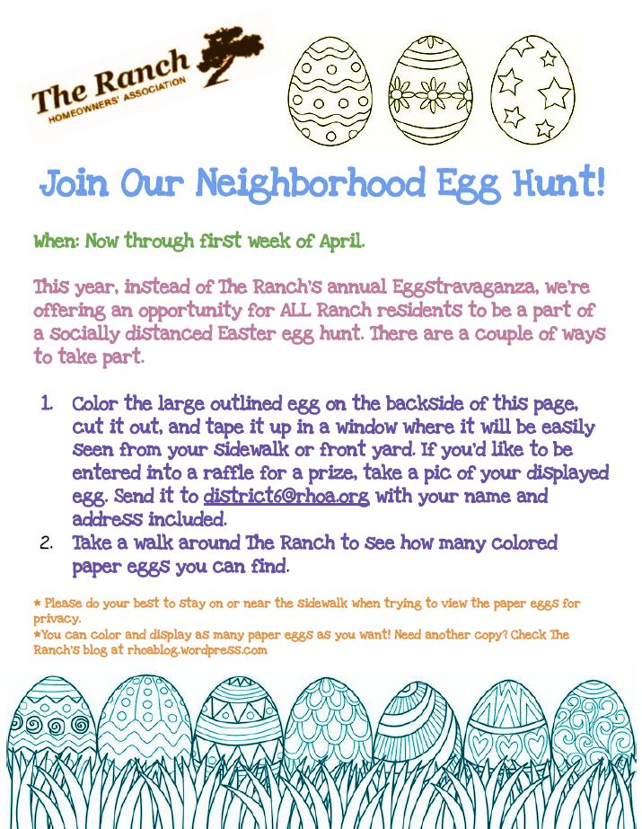 Join Our Neighborhood Egg Hunt! Posted on March 20, 2021 by RHOA Click here to download a copy of the Ranch Easter Egg Drawing Template. We can’t wait to see your creativity! Share this: Click to share on X (Opens in new window) X Click to share on Facebook (Opens in new window) Facebook Like Loading... Related