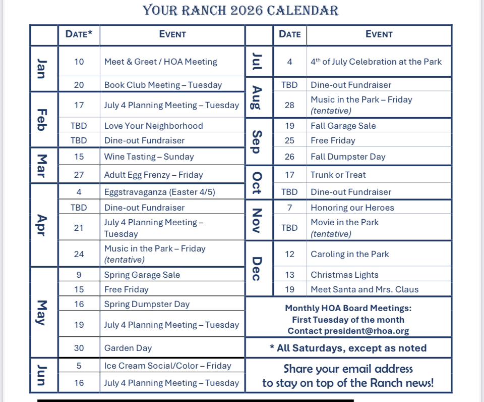 The RHOA Board Meetings take place monthly on the 1st Tuesday. RHOA members are invited to attend. For the location email : president@rhoa.org . HOA Members can request a copy of the RHOA Board Meeting Minutes by contacting the Ranch Secretary at : secretary@rhoa.org