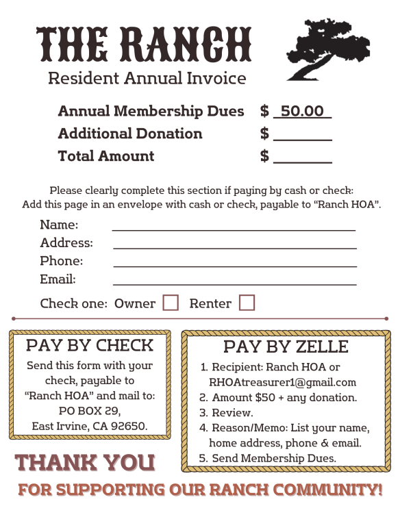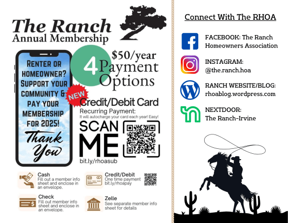 Whether you are a homeowner or renter, you are an important part of our community. Join our efforts to make The Ranch a vibrant place to live by becoming an RHOA member for ONLY $50 a year!
