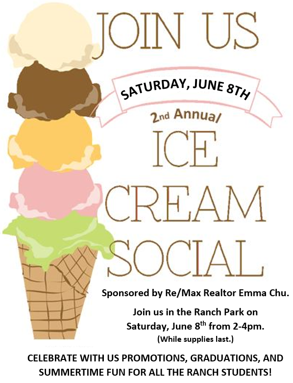 Please join us this Saturday, June 8th from 2-4 (or while supplies last) to enjoy our second annual Ice Cream Social, sponsored by Emma Chu!